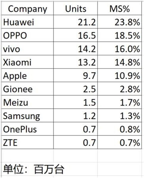 先来看看IDC全球统计报告,全球智能手机的领跑者依然是三星,市场份额仍达到了23.3%,同比下滑了2.4%,出货量是7820万部,苹果和华为紧随气候,出货量分别是5220万部和3930万部,市场份额是15.6%和11.8%,一个增长2.8%,而另外一个增长13.8%。