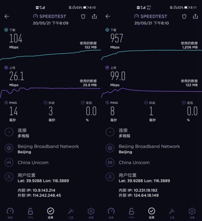 华为P40 Pro+搭载的麒麟990 5G SoC相信大家并不陌生,这款处理器集成了巴龙5000基带,支持NSA+SA双模组网,可以覆盖n79、n78、n77、n41、n28、n3、n1等频段,能在全球范围内连接5G网络。实测华为P40 Pro+的5G速度接近960Mbps,而智能上行分流的设计,在5G弱信号场景中也可以为我们提供更好的5G网络体验。