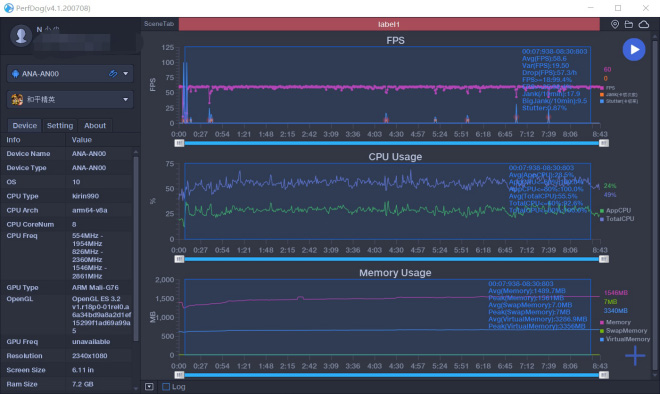 华为P40搭载麒麟990 5G芯片,在我们最关心的散热方面华为P40采用3D石墨烯液冷散热技术,由全新的3D石墨烯散热膜和超薄的液冷散热管组成更加紧密的贴个热源。我们来进行一局游戏实测一下,进行的为和平精英这款游戏,在测试帧率来说基本维持在一条稳定的直线,平均帧率58.6帧,测试为娱乐模式。