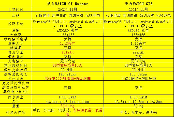 在高性价比的跑表中,我一直在华为Watch GT3和HUAWEIWATCH GT Runner 中在纠结,毕竟HUAWEI WATCH GTRunner要贵600元,贵在哪里,我反复翻阅规格参数表,将区别整理如下,供君参考: