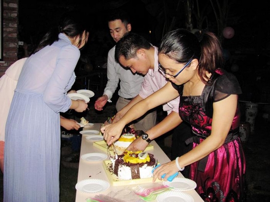 值得一提的是,在寿星们上台、发表感言、抽奖时,天上不断降落甘露,大家都以为是下雨了,不想那水有味道,是啤酒。再一看,原来是甘总一直在恶作剧。大伙都被甘总的创意逗笑了。