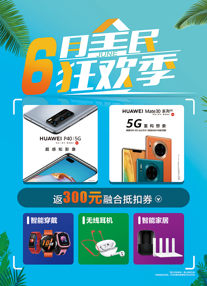 当前位置:主页 > 新闻中心 > 新品速递 > 6月全民狂欢季,购买华为旗舰手机返300元融合抵扣券