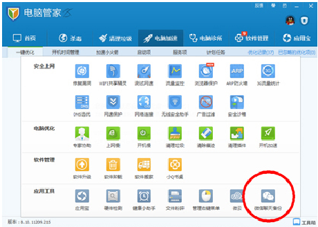其次,你得下载电脑管家微信版,找到右下角的工具箱,点击应用工具——聊天记录备份。