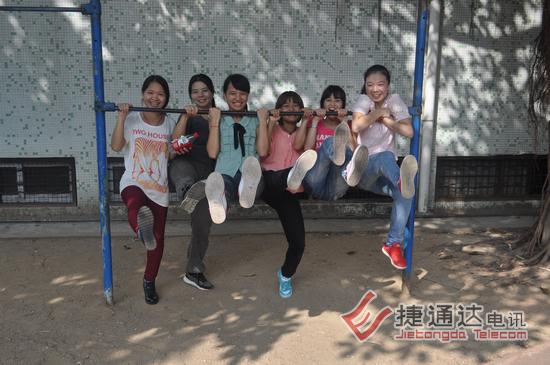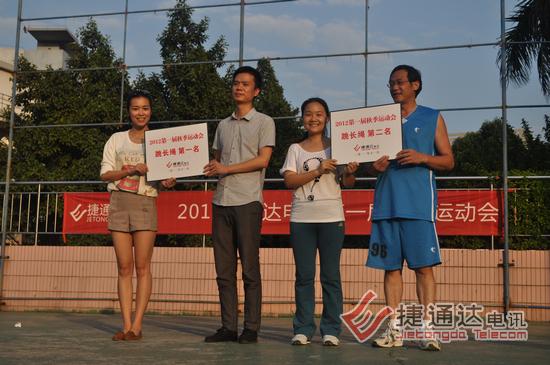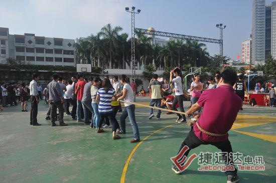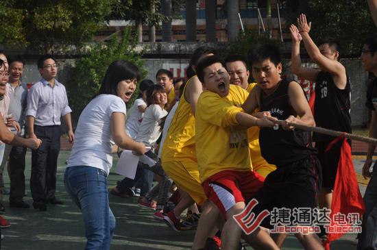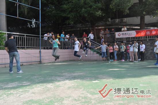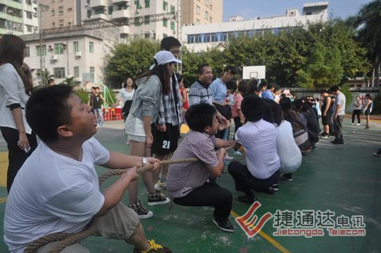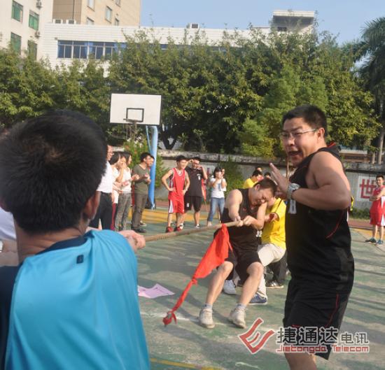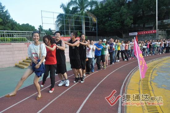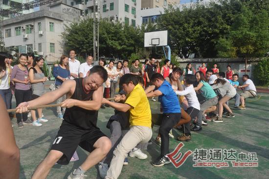 捷通达电讯有限公司后面的东晖学校运动场,彩旗飘飘,热闹非凡。2012年捷通达第一届秋季运动会在这里隆重召开。活动项目分为拔河、跳长绳、男子篮球等项目。其中,拔河和跳长绳按照之前的意愿,两个中心组成一个联队对抗,3局两胜制,最终会计连锁联队获得了拔河第一名,运营中心队获得了第二名。跳长绳第一、二名则被市场营销战略联队和运营中心队获得。这两个集体项目,前二名分别获得600、500元奖金。