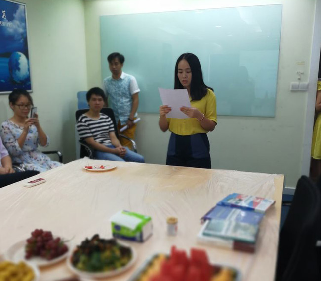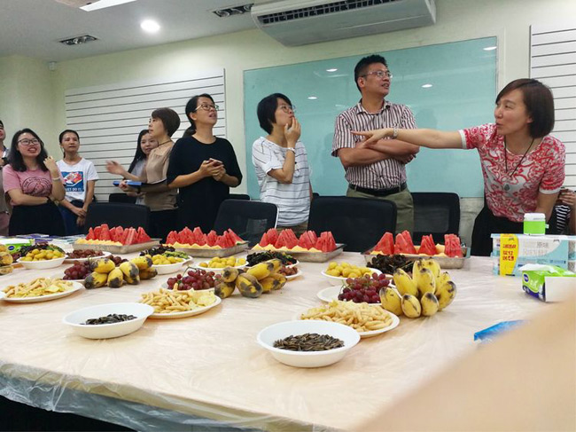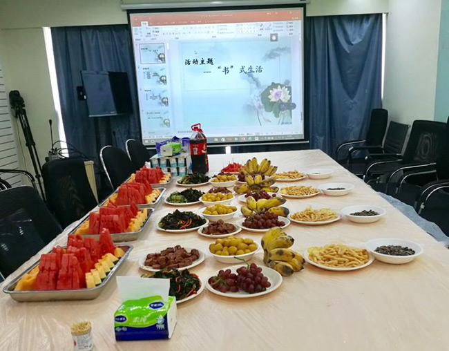 总部下午茶火热进行的同时,火炼树办公的同事的下午茶活动也如期举行,他们把几张桌子拼成一个大桌,铺上红布,摆满食物,主持人用手提电脑替代了屏幕,活动中你一段我一段的文章朗诵、你一题我一题的踊跃抢答照样精彩,相比总部稍为简陋的办公环境并不能削减大家对下午茶活动的参与热情。