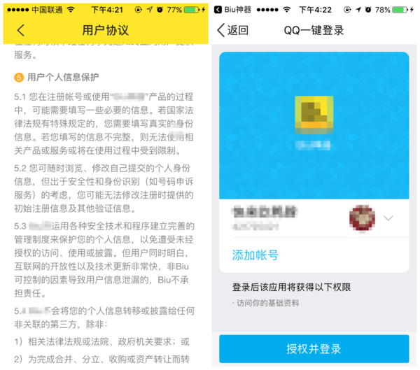 一天,小明下班后,在登录手机应用中,无意发现了快捷登录,(快捷登录是指:在登录应用或网站帐号时,只用点击QQ或微信,微博登录等,无需注册账号即可授权登录)小明点击快捷登录,登录成功。小明惊喜发现该功能极为方便,在以后登录手机应用或网页界面时均使用快捷登录。