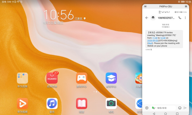 平板移动办公或者影音娱乐时,不会错过手机消息。来自手机的消息通知会在平板消息通知栏提醒,点击消息通知,一步直达手机消息应用。